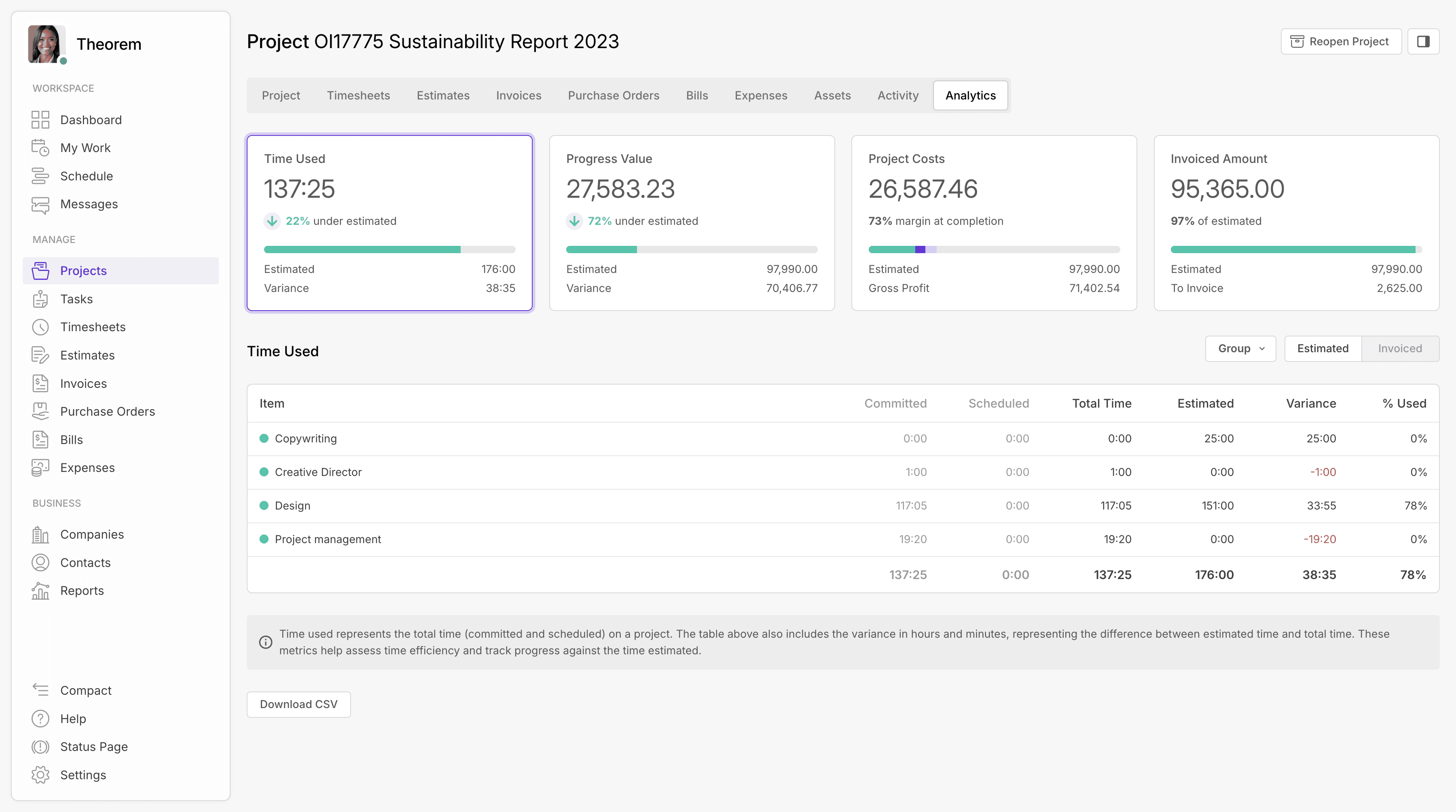 Detailed analytics show time, cost, and progress across every project, helping managers make confident, data-led decisions.