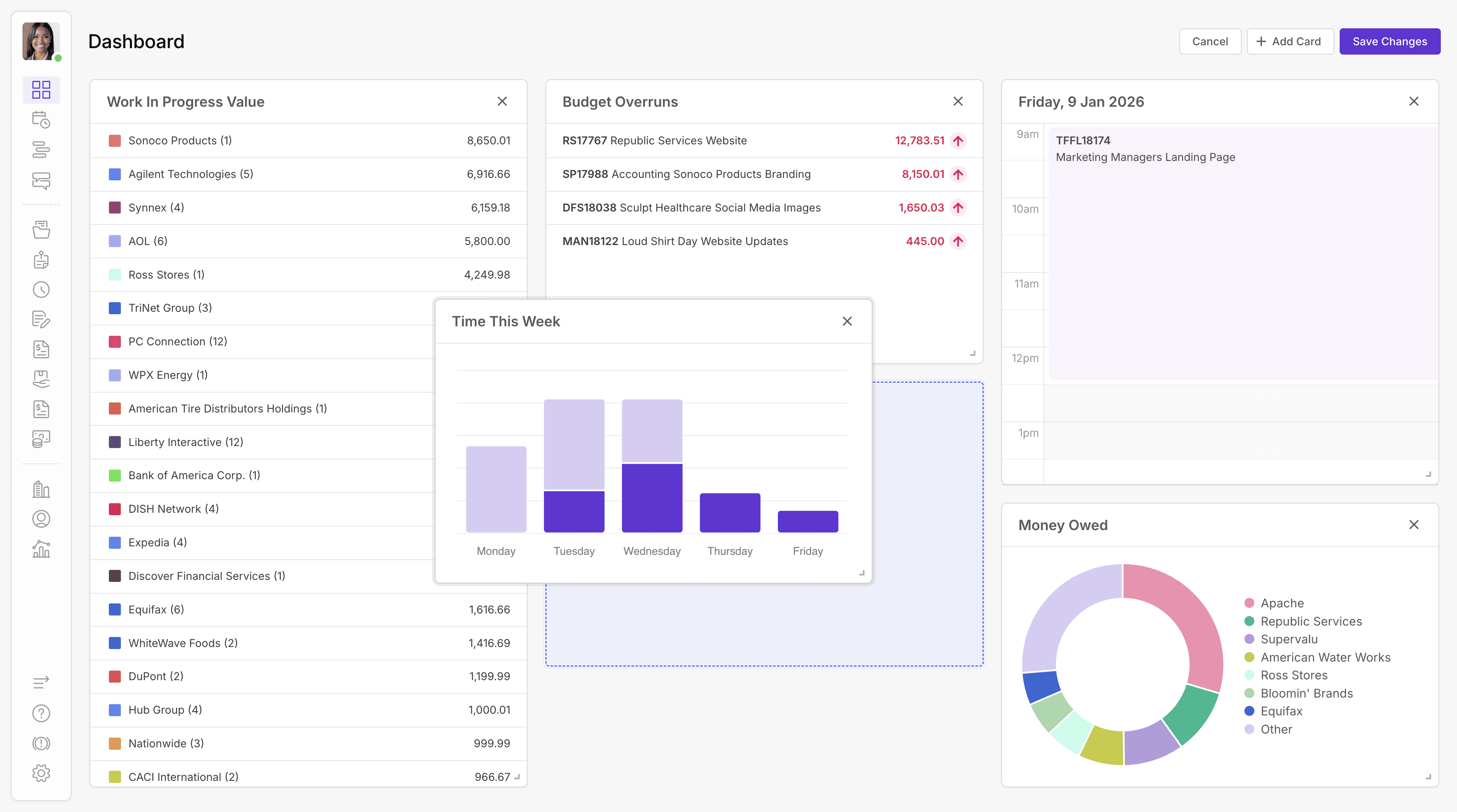 Detailed analytics show time, cost, and progress across every project, helping managers make confident, data-led decisions.